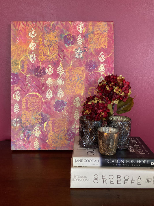 Using stamps and stencils I incorporate rhythm and pattern into my art to express a sense of positive energy and restful retreat. Who doesn’t want more of that?