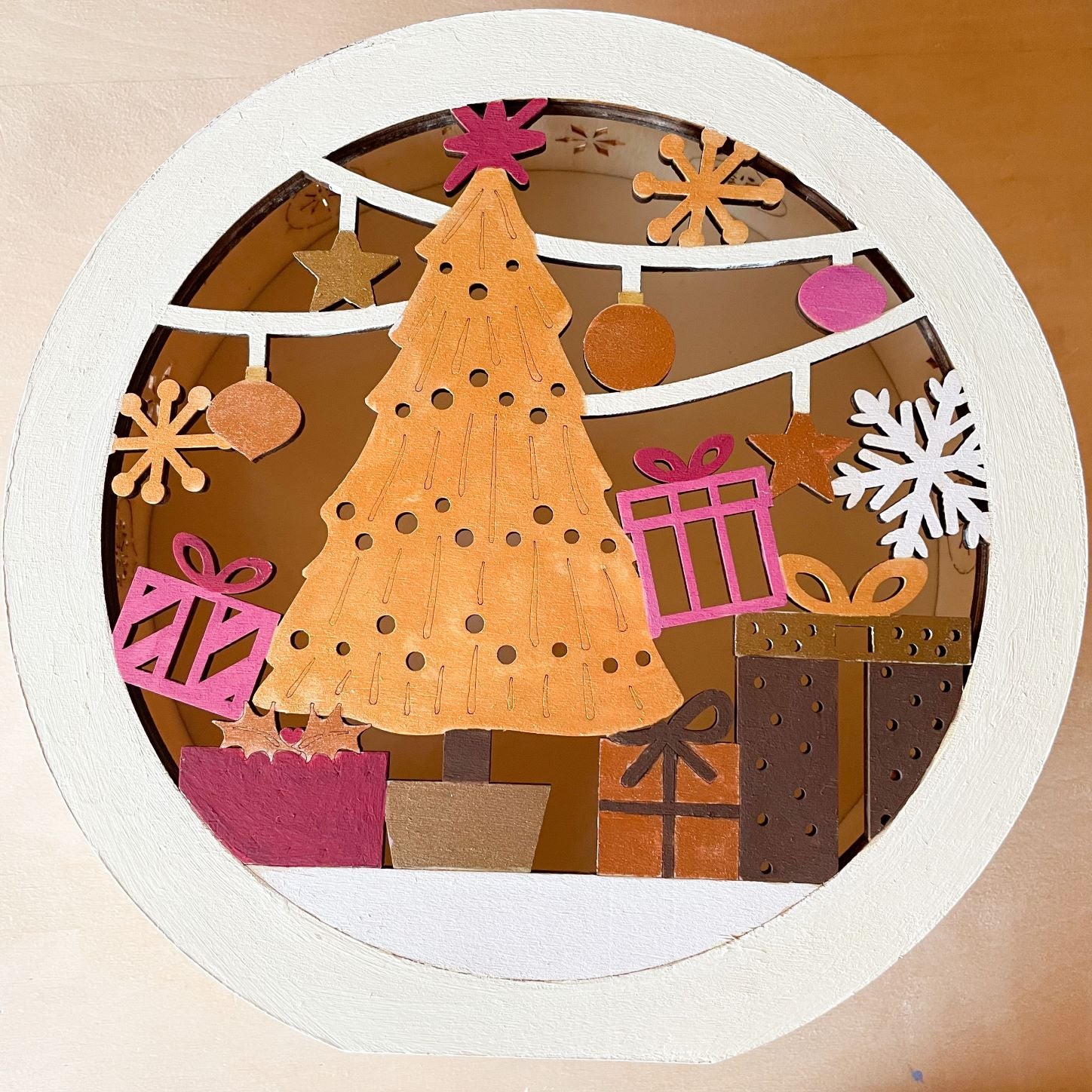 This scene features gifts under the beloved Christmas Tree with a gold, bronze & pink color palette.