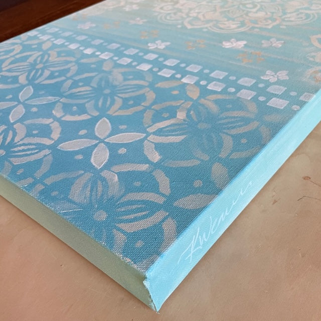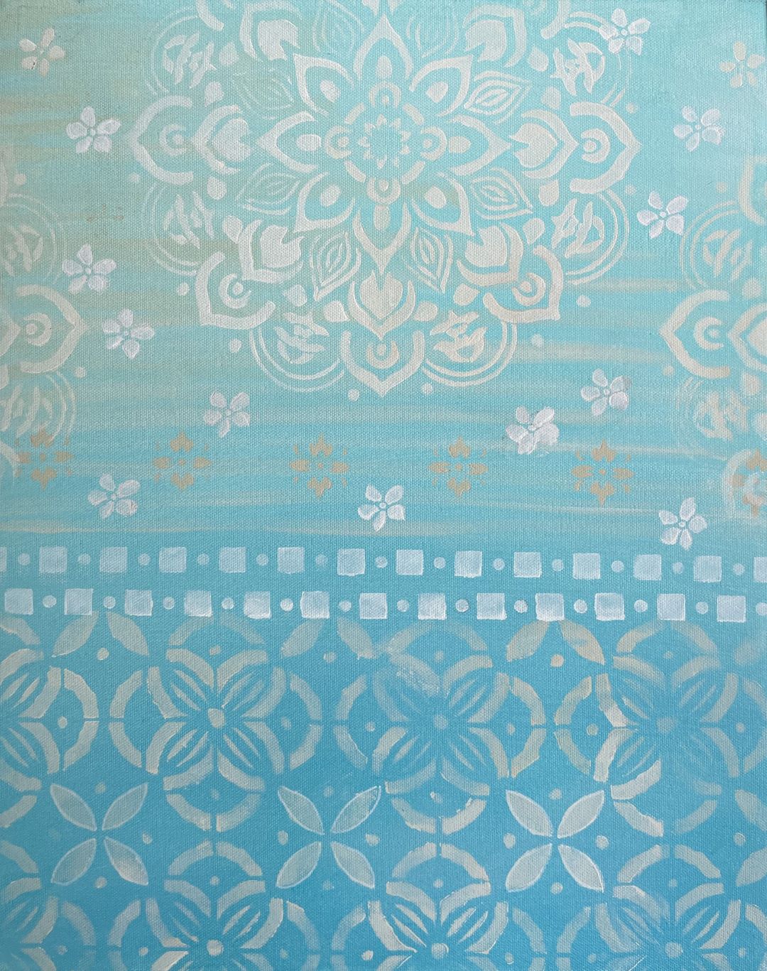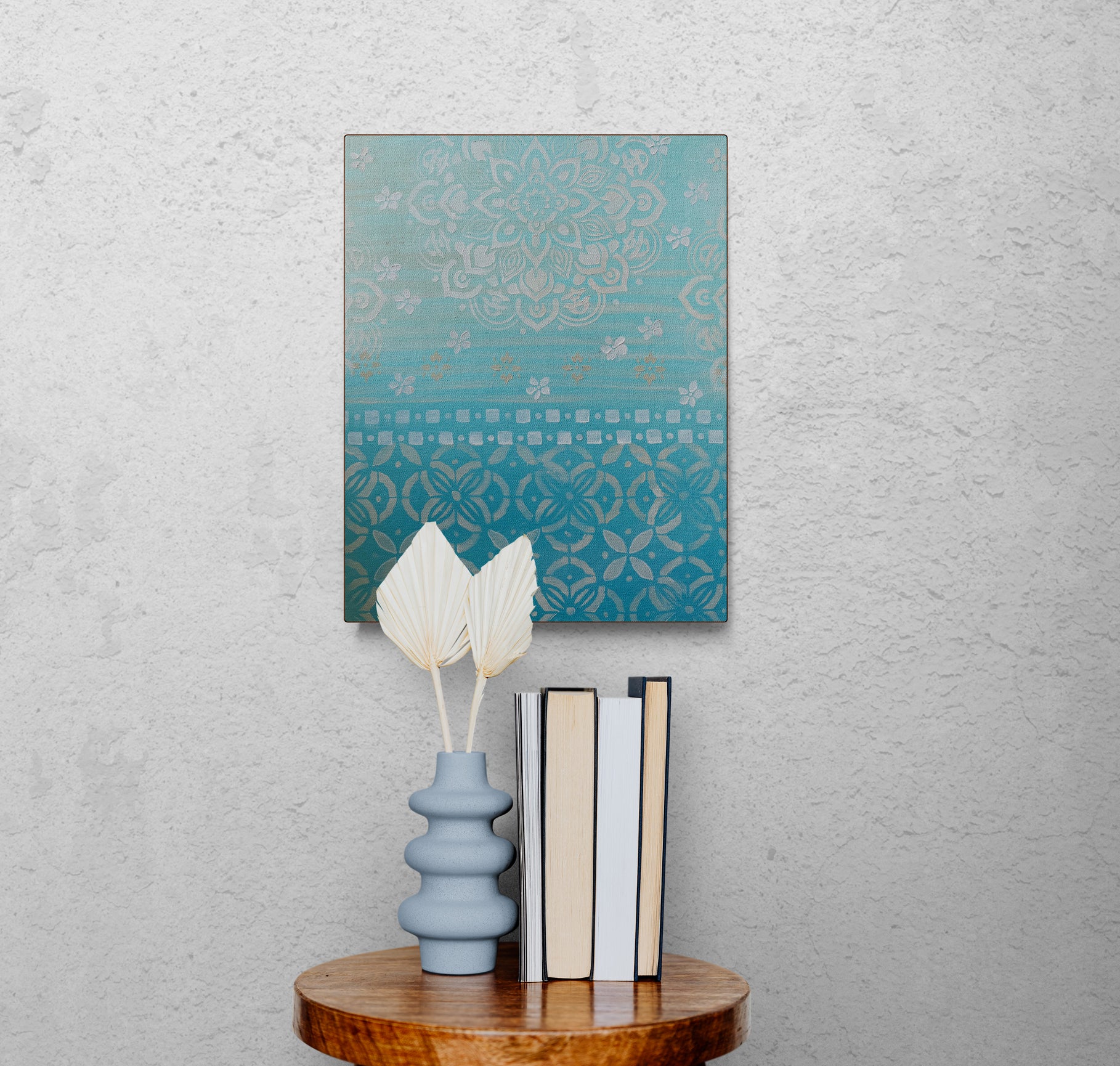 This painting was inspired by the cycle of the seasons in the light of summer. Enjoy this luminous mandala bathed in turquoise blue.