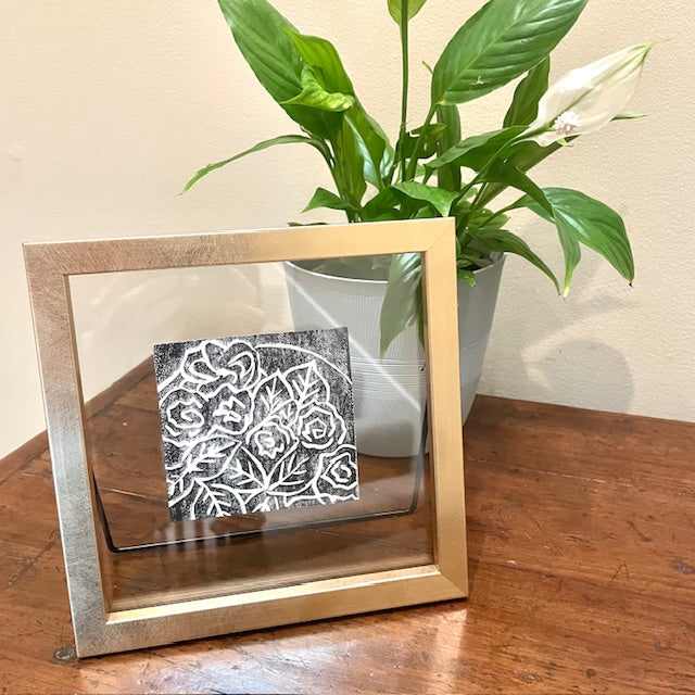 This linocut was inspired by a late blooming rose in my backyard. As summer dissipates this single rose offered a bit of beauty as we transition into the next season.