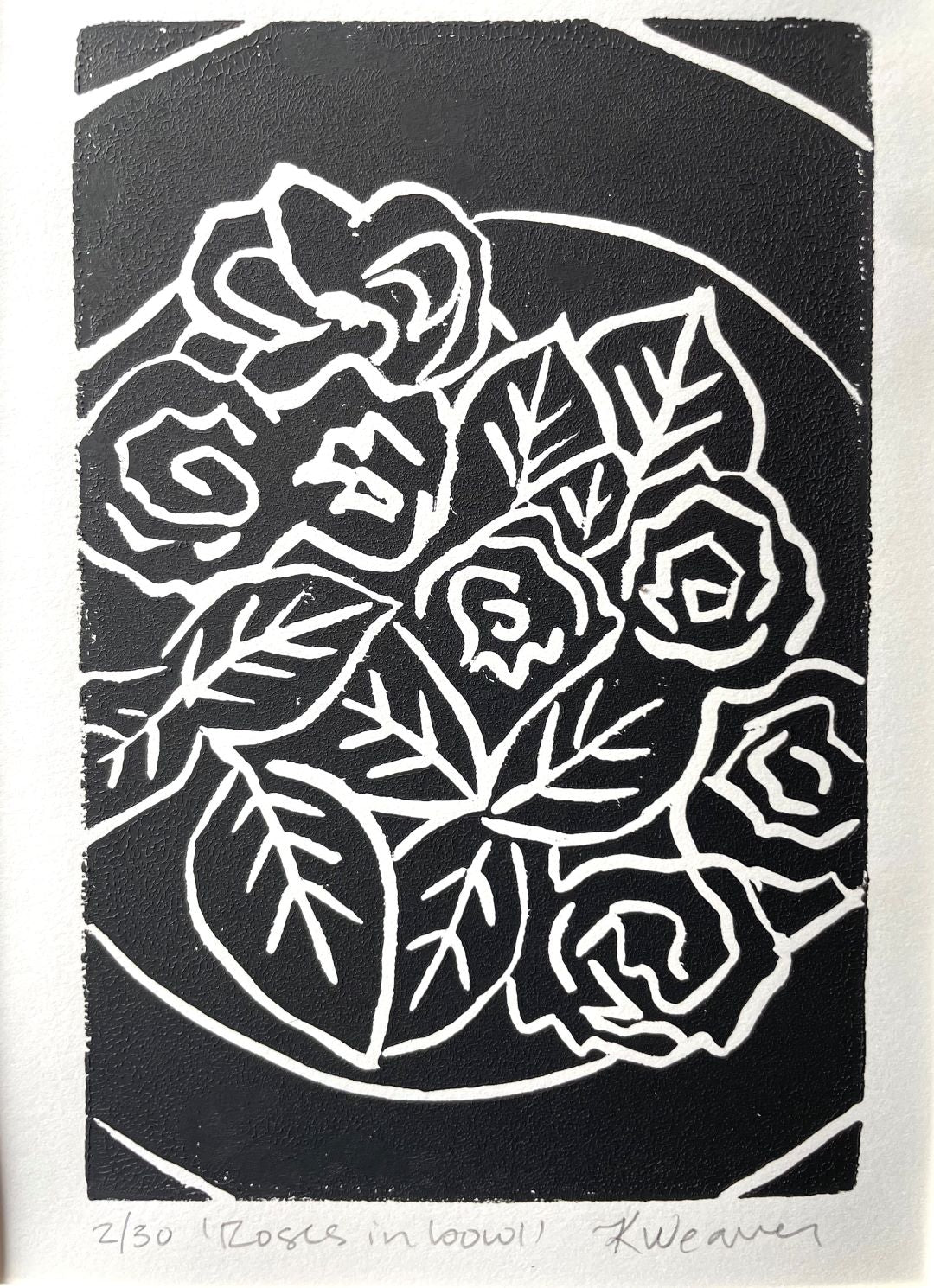 I hand carved this piece on a linocut block, then rolled the block with a rich black ink and printed it on paper.