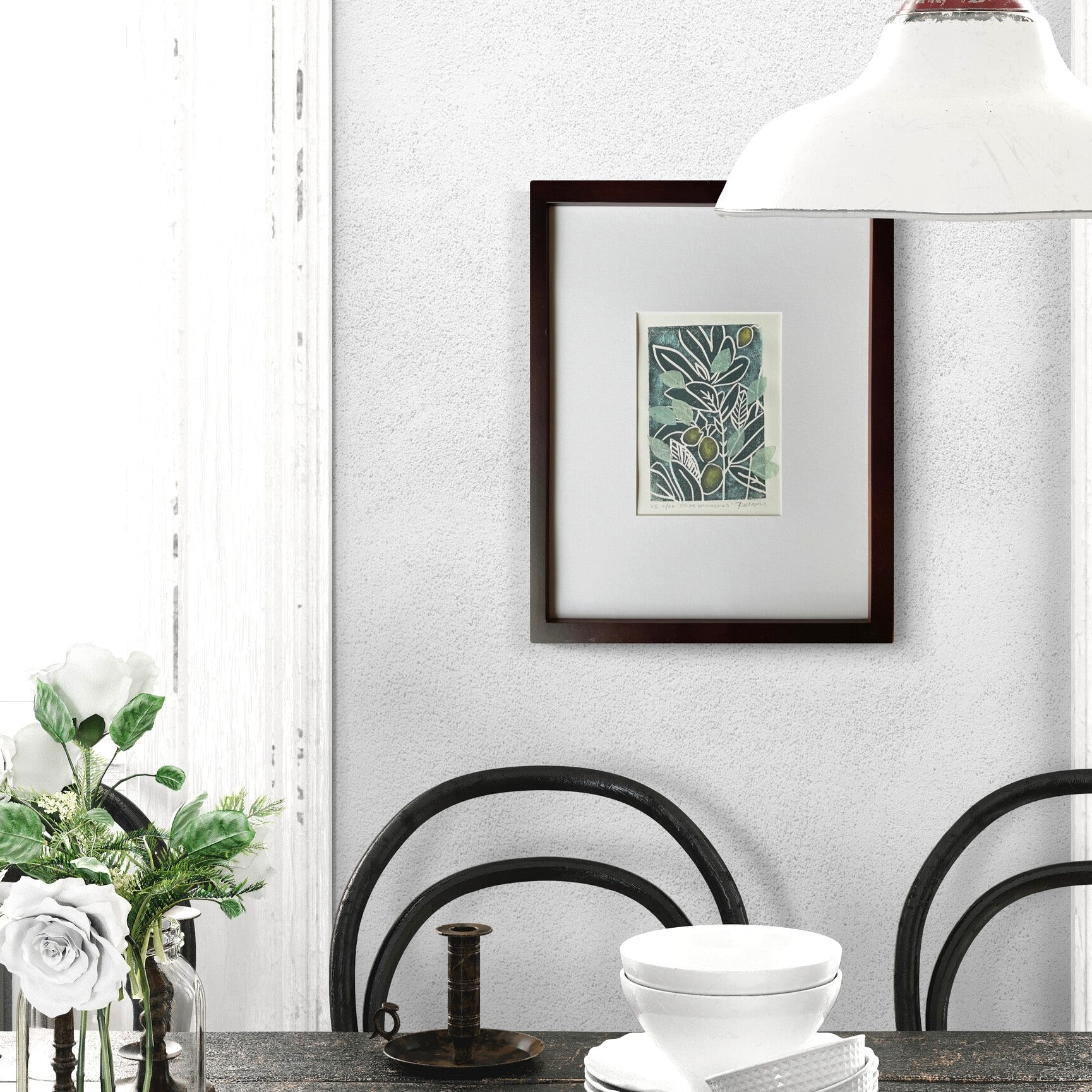 This linocut was inspired by a cluster of faux olive branches I have displayed in a vase in my home. I'm drawn to their elegant shape and wayward leaves.