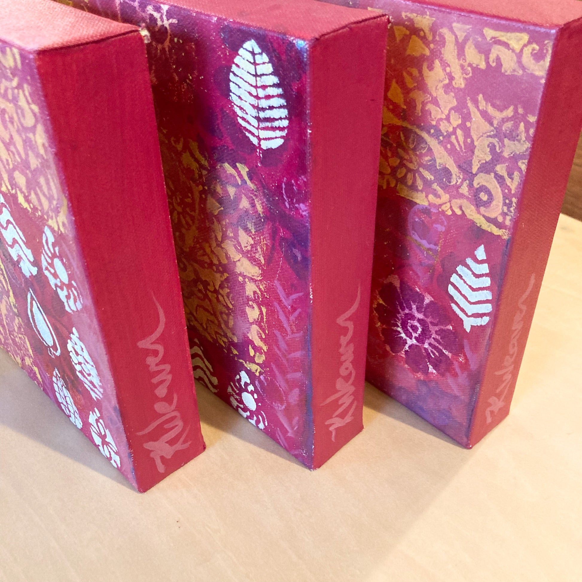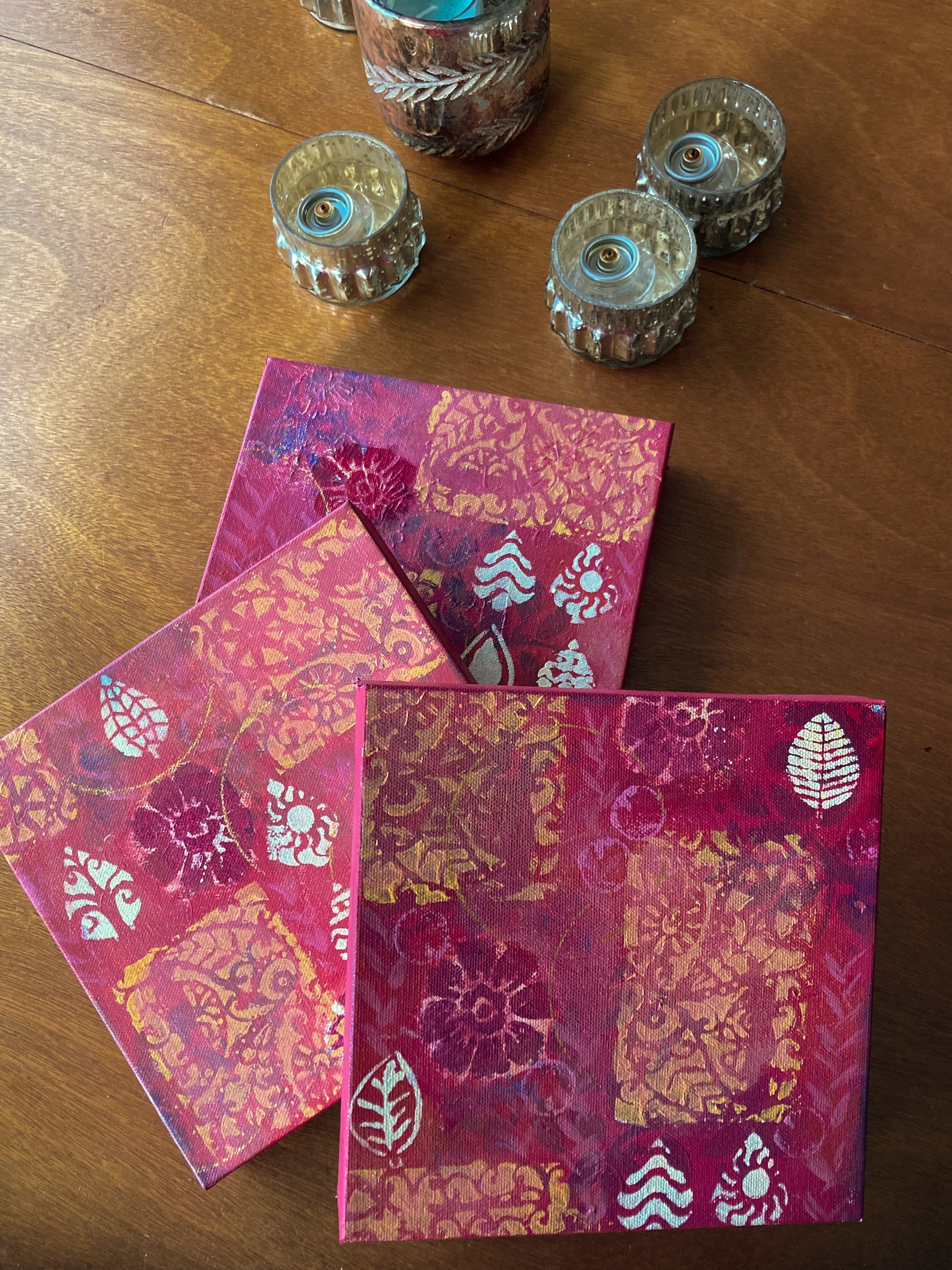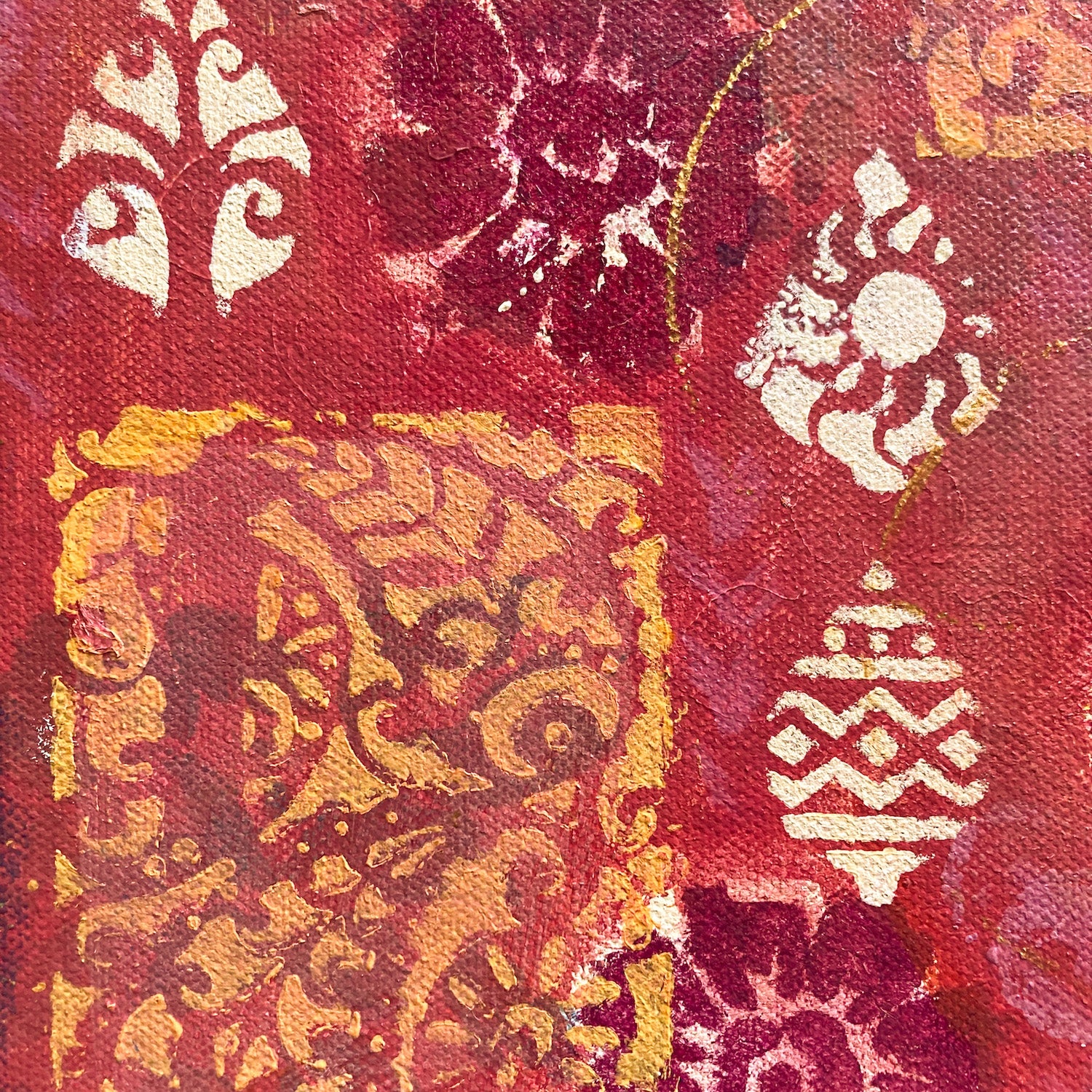 The patterns in this painting have a bit of a tribal feel, influenced by my college days studying anthropology. Flowers, leaf prints, and circular shapes remind us of our connection to the earth and one another.